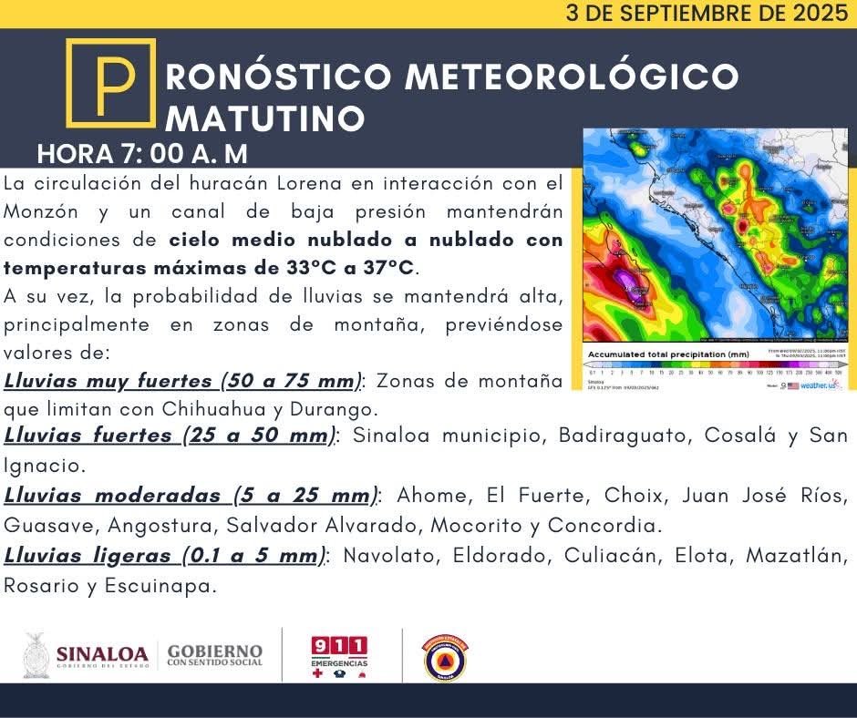 Leer más...Mazatlán | Sinaloa | Condiciones de cielo medio nublado a nublado con temperaturas que oscilarán entre 33°a 37°centigrados, mientras que…