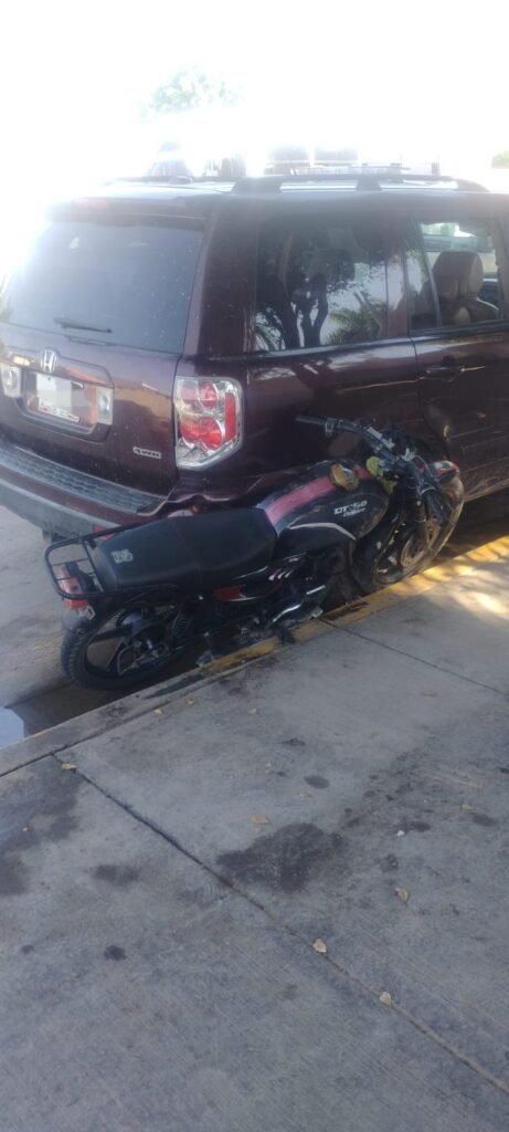 El incidente involucró a tres vehículos: un automóvil tipo sedán Toyota Corolla color gris modelo 2024, conducido por Rogelio Ernesto N., de 38 años; una motocicleta Italika FT-150 modelo 2016, color negro y rojo, conducida por Jesús Manuel N., de 30 años; y una camioneta tipo vagoneta Honda Pilot modelo 2007, propiedad de José Eduardo N., que se encontraba estacionada.