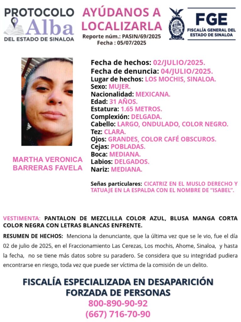 Ahome | Sinaloa | La Fiscalía General del Estado de Sinaloa activó el protocolo ALBA con la finalidad de localizar a Marta Verónica Barrera Alfabel, una mujer de 31 años originaria de Los Mochis, quien fue vista por última vez el pasado 2 de julio en el fraccionamiento Las Cerezas, municipio de Ahome.