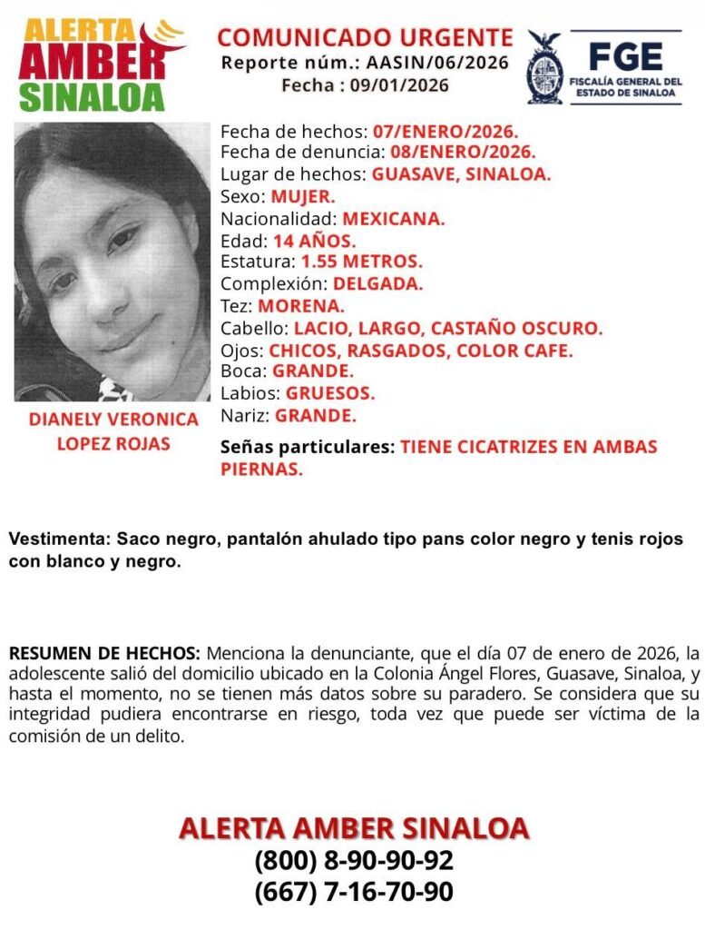 Guasave | Sinaloa | Autoridades activaron el protocolo de búsqueda para localizar a Dianely Verónica López Rojas, adolescente de 14 años de edad, quien fue reportada como desaparecida tras salir de su domicilio en la colonia Ángel Flores, en la ciudad de Guasave.