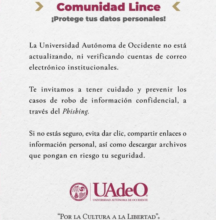 Los Mochis | Sinaloa | La Universidad Autónoma de Occidente (UAdeO) emitió un aviso urgente a la comunidad universitaria, exhortando a estudiantes, docentes y personal administrativo a proteger sus datos personales ante posibles intentos de phishing o robo de información mediante correos electrónicos falsos.