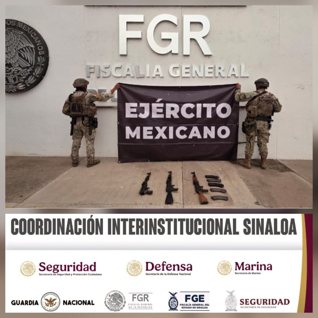 Culiacán | Sinaloa | Elementos del Ejército Mexicano, en coordinación con la Guardia Nacional, la Secretaría de Marina, la Secretaría de Seguridad y Protección Ciudadana, la Fiscalía General de la República, la Fiscalía General del Estado y la Secretaría de Seguridad Pública Estatal, a través de la Policía Estatal Preventiva, aseguraron armamento, cargadores y municiones en la sindicatura de Tepuche, al norte de la capital sinaloense.