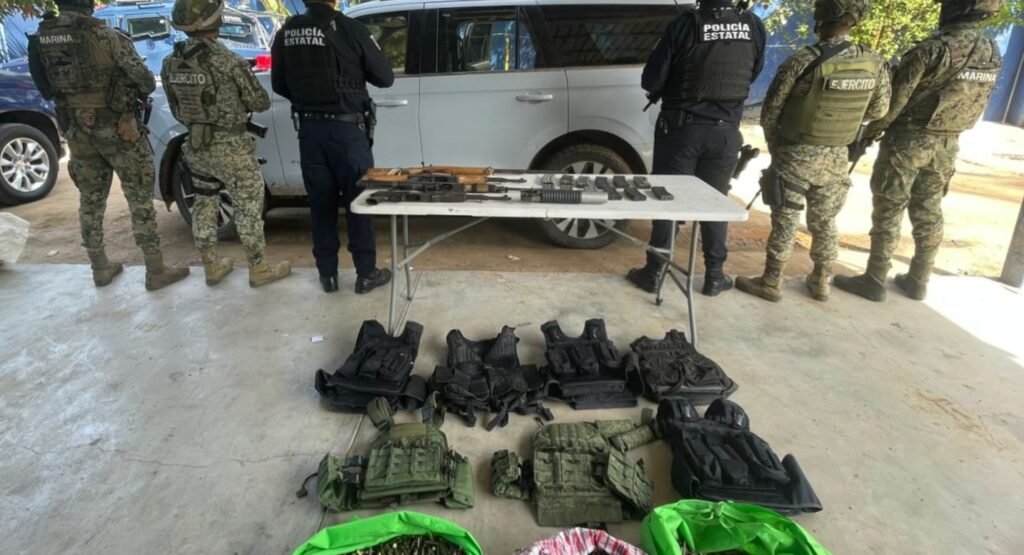 Asimismo, se decomisaron siete chalecos tácticos, los cuales, junto con el armamento, municiones y el vehículo, fueron puestos a disposición del Ministerio Público Federal para que se realicen las investigaciones correspondientes conforme a la ley.