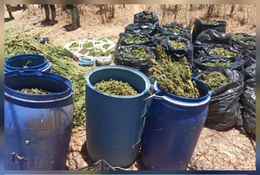 Más tarde, en una segunda acción llevada a cabo en el poblado El Dique, fueron encontradas 24 bolsas negras con hierba seca, cuyo peso oscila entre los 8 y 10 kilogramos cada una. Además, se aseguraron cuatro tambos azules con capacidad de 200 litros, también con posible marihuana en su interior, y ramas secas de la misma planta, con una altura de un metro y un peso estimado de 150 kilogramos.