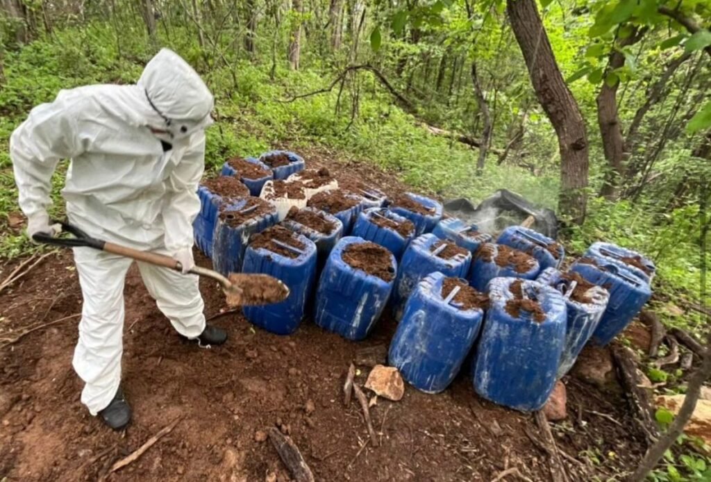 Mientras tanto, en el municipio de Culiacán, las autoridades castrenses ubicaron otro punto utilizado para el almacenamiento de sustancias químicas. En el lugar se aseguraron 1,000 litros de ácido muriático, 10 litros de acetona, 400 kilogramos de sosa cáustica y 150 kilogramos de hidróxido de sodio en escamas.