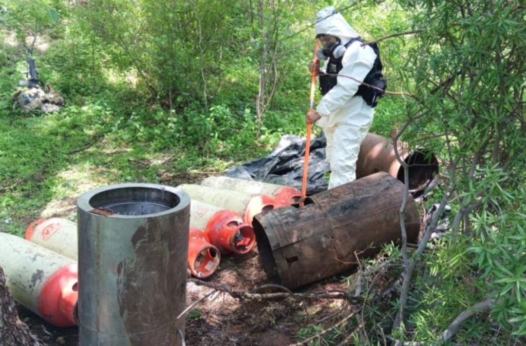En el municipio de Cosalá, personal militar localizó un sitio utilizado como centro de concentración para la elaboración de drogas sintéticas, donde aseguraron tres mezcladoras y seis cilindros de gas con capacidad total de 120 litros.