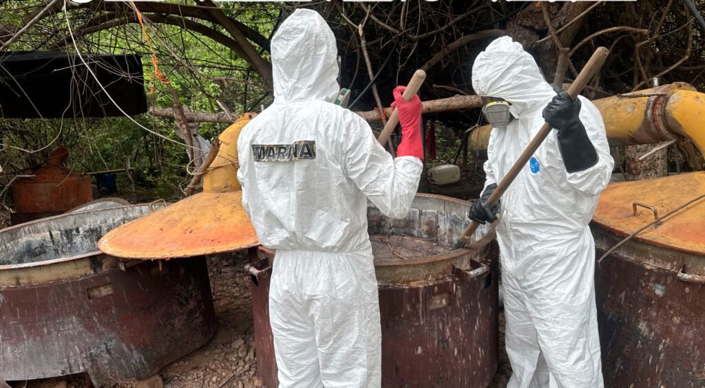 Culiacán | Sinaloa | Autoridades federales aseguraron un narcolaboratorio en el poblado de Abuya, municipio de Culiacán, donde fueron encontrados aproximadamente 950 kilogramos de metanfetamina, así como diversos materiales e insumos utilizados en la fabricación de droga sintética.