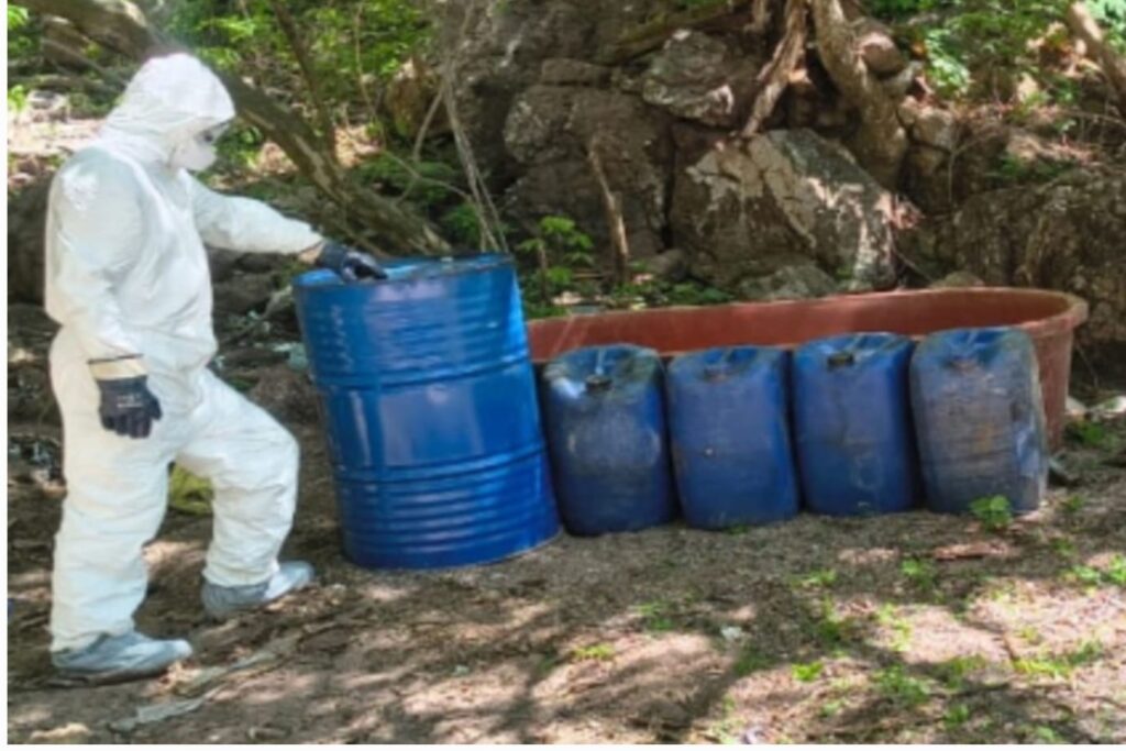 En el marco de la “Operación Búsqueda, Localización y Destrucción de Laboratorios Clandestinos”, personal militar localizó los sitios durante recorridos terrestres, encontrando diversos materiales químicos y utensilios usados para la fabricación de drogas sintéticas, como acetona, tolueno, alcohol etílico, cianuro de sodio, sosa cáustica, entre otros compuestos y herramientas.