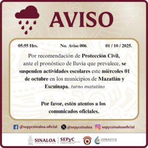 Mazatlán | Sinaloa | De acuerdo a la información emitida por la Coordinación Municipal de Protección Civil, las probabilidades de