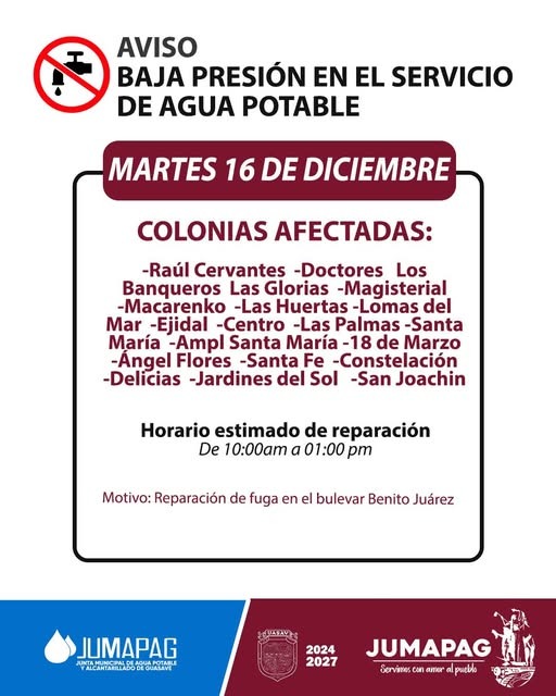 De acuerdo con el aviso emitido por el organismo operador, las colonias que podrían registrar afectaciones son Raúl Cervantes Ahumada, Doctores, Los Banqueros, Las Glorias, Magisterial, Macario, Las Huertas, Lomas del Mar, Ejidal Centro, Las Palmas, Santa María, Ampliación Santa María, 18 de Marzo, Ángel Flores, Santa Fe, Constelación, Delicias, Jardines del Sol y San Joaquín.
