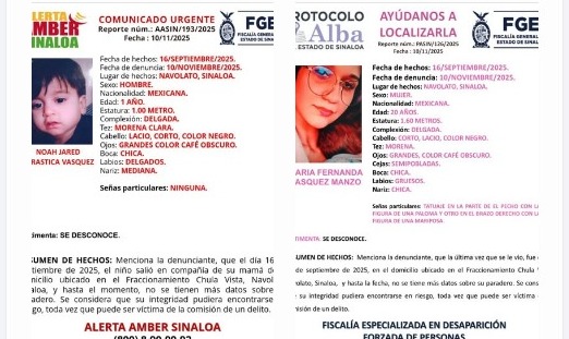 Navolato | Sinaloa | La Fiscalía General del Estado de Sinaloa activó el protocolo de búsqueda tras la desaparición de María Fernanda Vázquez Manso y su hijo Noah Jared Verástica Vázquez, un bebé de un año de edad, vistos por última vez el pasado 16 de septiembre de 2025 en el fraccionamiento Chulavista, en el municipio de Navolato.