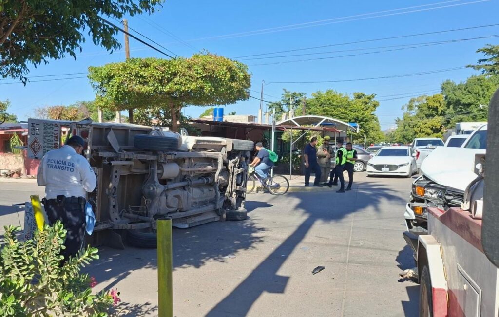 Los Mochis | Sinaloa | Un aparatoso accidente automovilístico registrado la tarde de este jueves generó alarma entre vecinos del sector sur de la ciudad de Los Mochis, luego de que una camioneta repartidora de tanques de gas terminara volcada tras un choque ocurrido en un cruce de vialidades, dejando como saldo una mujer lesionada y cuantiosos daños materiales, además del temor inicial de una posible explosión.