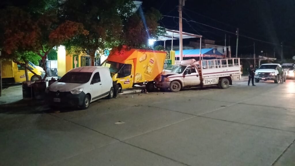 Guasave | Sinaloa | Una carambola que involucró cuatro vehículos, entre ellos unidades de reparto de reconocidas empresas, se registró la noche del jueves 17 de julio en el sector Ángel Flores, dejando como saldo únicamente daños materiales.