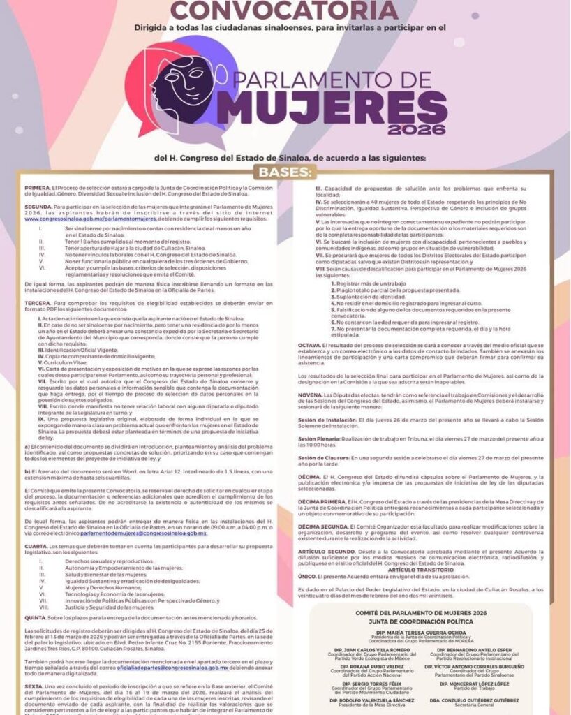 Sinaloa / El Instituto Municipal de las Mujeres de Guasave informó que el Congreso del Estado de Sinaloa, a través del Comité del Parlamento de Mujeres 2026 de la LXV Legislatura, emitió la convocatoria dirigida a todas las ciudadanas sinaloenses interesadas en participar en este ejercicio democrático que se instala cada año durante el mes de marzo.
