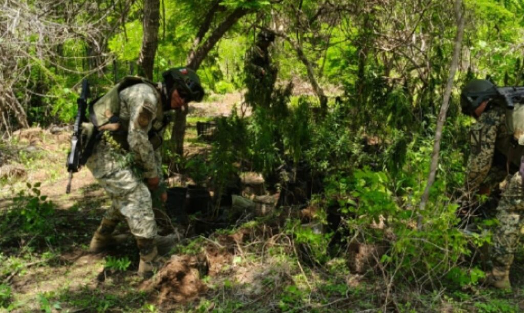 Culiacán | Sinaloa | Elementos del Ejército Mexicano, en coordinación con la Guardia Nacional, Secretaría de Marina, Secretaría de Seguridad y Protección Ciudadana, Fiscalía General de la República, Fiscalía General del Estado y Policía Estatal Preventiva, localizaron y destruyeron una zona de almacenamiento de precursores químicos, así como un plantío de marihuana, en el municipio de Culiacán.