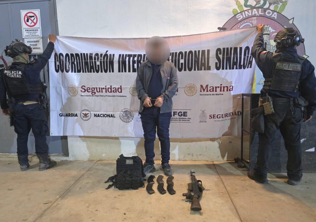 En el lugar se aseguró un fusil AK-47 calibre 7.62×39, seis cargadores, 165 cartuchos útiles y un chaleco táctico con placas balísticas.