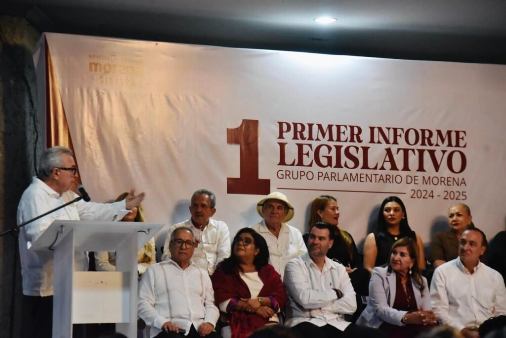 Ahome / Sinaloa / En un ambiente de unidad y compromiso social, el Grupo Parlamentario de Morena presentó su Primer Informe Legislativo 2024-2025 en Los Mochis, donde participaron el Gobernador Rubén Rocha Moya, el Presidente Municipal Antonio Menéndez De Llano Bermúdez, la diputada María Teresa Guerra Ochoa, coordinadora del grupo y presidenta de la Junta de Coordinación Política del Congreso del Estado de Sinaloa, entre otros representantes populares.