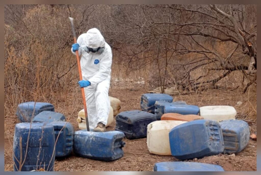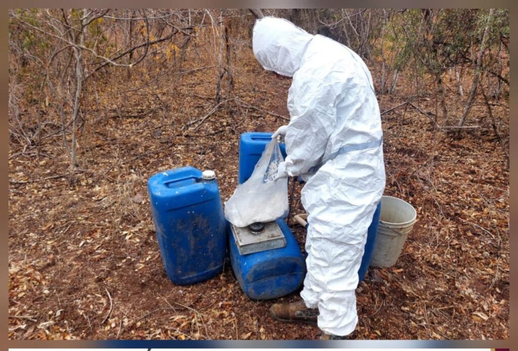 Personal del Ejército Mexicano, en coordinación con la Guardia Nacional, la Secretaría de Marina, la Secretaría de Seguridad y Protección Ciudadana, la Fiscalía General de la República, la Fiscalía General del Estado y la Secretaría de Seguridad Pública de Sinaloa, localizó cinco áreas de concentración de precursores químicos.