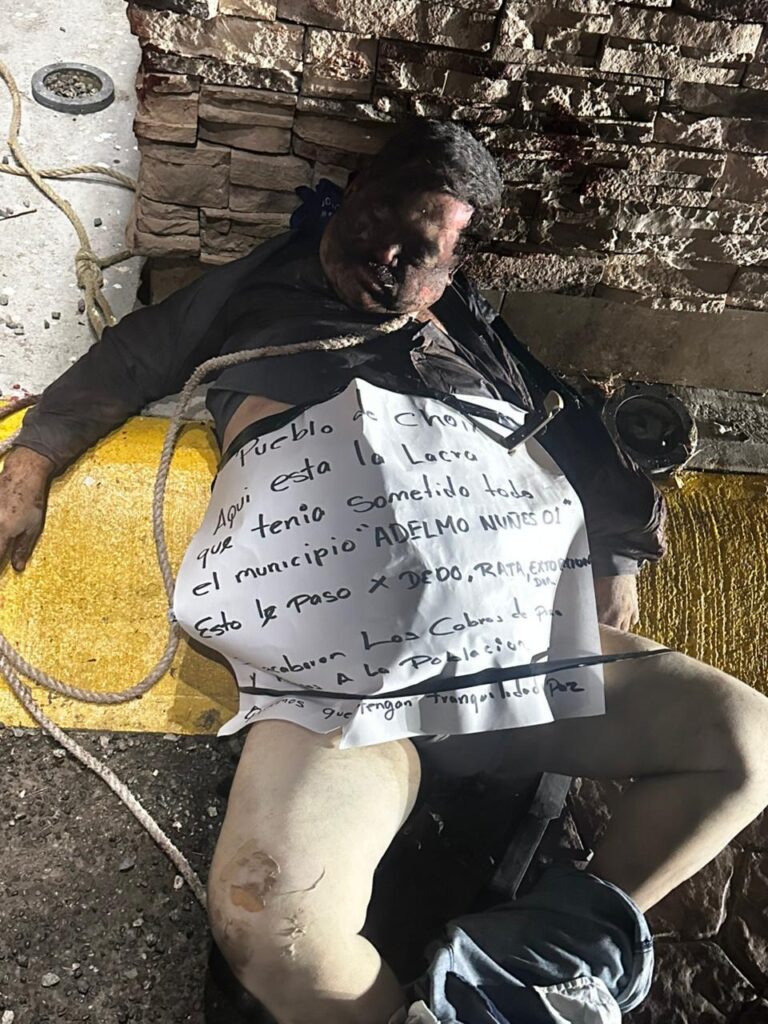“Pueblo de Choix, aquí está la lacra que tenía sometido a todo el municipio, Adelaido Nuñes 01. Esto le pasó por dedo, rata, extorsionador. Se acabaron los cobros de piso a la población. Queremos que tengan tranquilidad y paz.”
