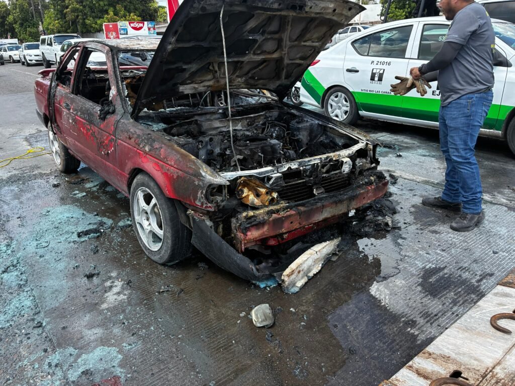 Ahome / Sinaloa / Un automóvil quedó reducido a cenizas la tarde de este martes, luego de incendiarse en plena vía pública del sector sur de Los Mochis, presuntamente a causa de una falla mecánica.