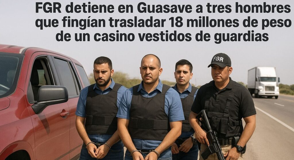 Guasave | Sinaloa | La Fiscalía General de la República (FGR), a través de su subsede en Guasave, aseguró el sábado 13 de septiembre a tres hombres que pretendían trasladar 18 millones de pesos presuntamente provenientes de un casino, simulando ser custodios de un vehículo de valores o empresa de seguridad.