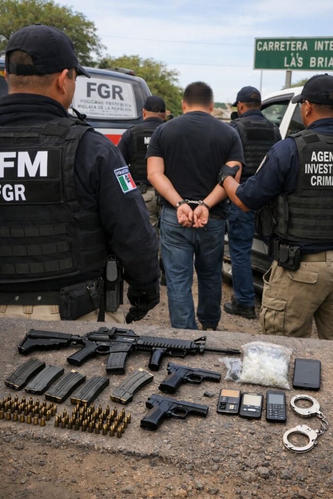 De acuerdo con la investigación, derivada de una denuncia anónima, la detención se realizó sobre la carretera Internacional México 15, a la altura del poblado Las Brisas, donde fue asegurado Jorge “J”, quien viajaba en un vehículo en el que se localizaron tres armas de fuego, 705 cartuchos, nueve cargadores, 17 gramos con dos miligramos de clorhidrato de metanfetamina, un teléfono celular y otros objetos.