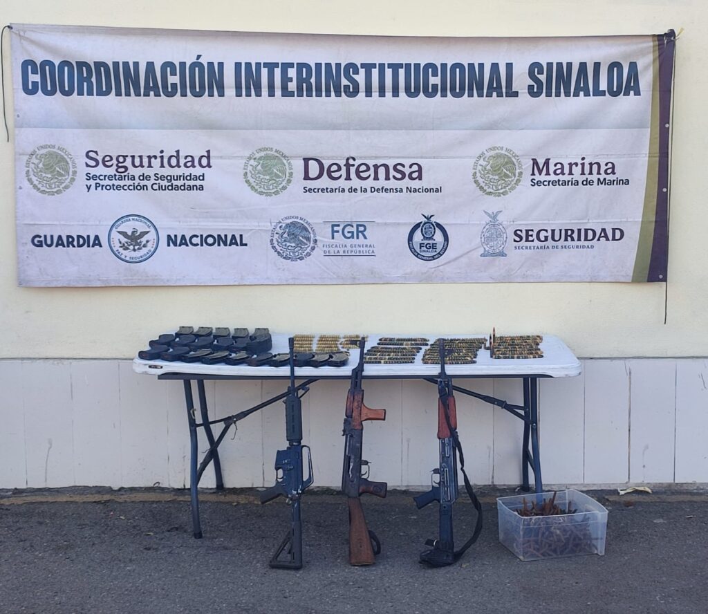 Fuerzas de seguridad aseguran arsenal, droga, equipo táctico y vehículos en Rosario, Sinaloa, durante operativos interinstitucionales en el Ejido Cajón Ojo de Agua