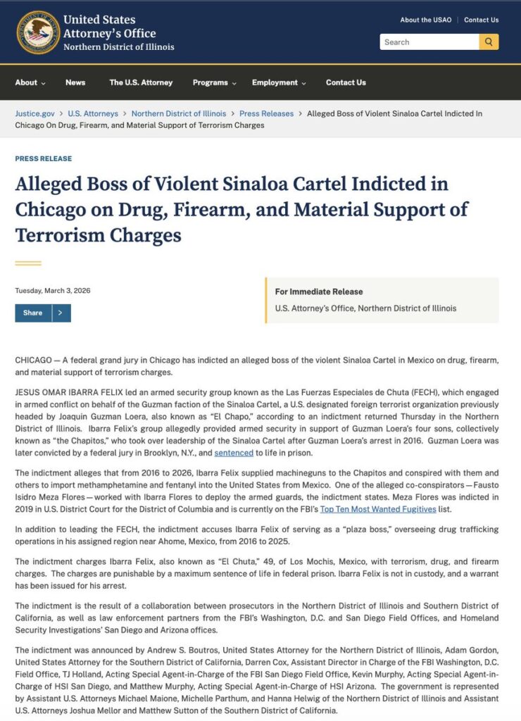 Sinaloa | Un gran jurado federal en Chicago imputó a Jesús Omar Ibarra Félix, alias “El Chuta”, por delitos relacionados con drogas, armas y apoyo material al terrorismo, de acuerdo con información difundida por la agencia internacional de noticias EFE.