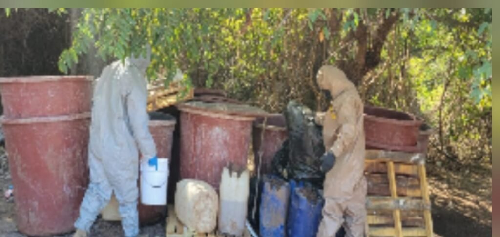 De acuerdo con la información oficial, en el sitio fueron localizados y asegurados diversos contenedores con sustancias químicas, entre ellos tinacos con acetona y alcohol etílico, bidones con bencilo y tolueno, así como costales con hidróxido de sodio en escamas, material que fue considerado de riesgo.
