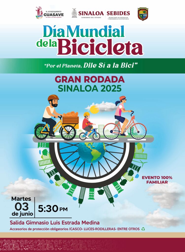 Guasave | Sinaloa | El Ayuntamiento de Guasave, a través de la Dirección General de Bienestar del Ayuntamiento invita a niños, jóvenes y familias del municipio a la Gran Rodada Sinaloa 2025 “Por el Planeta, Dile Sí a la Bici”, que organiza la SEBIDES de manera simultánea en todo el estado, el próximo martes 3 de junio, en el marco del Día Mundial de la Bicicleta.