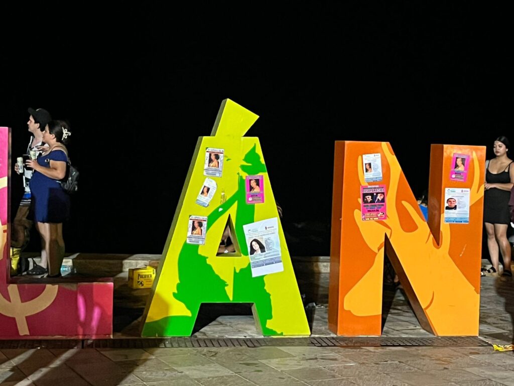 Las emblemáticas letras de MAZATLÁN se convirtieron en un símbolo de protesta. Ahí, familiares de personas desaparecidas colocaron fotografías, boletines y mensajes con frases como “Queremos un Mazatlán seguro”, exigiendo respuestas ante las desapariciones que han sacudido a la comunidad.