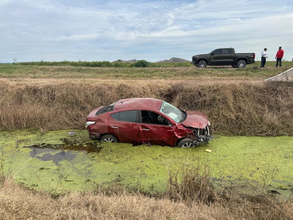 Debido a la velocidad con la que circulaba, la unidad dio varias volteretas hasta quedar sobre sus neumáticos dentro de un dren agrícola que corre paralelo a la carretera, a un costado de terrenos de cultivo.