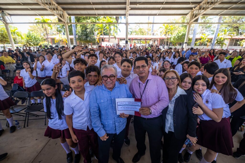 Además, anunció la rehabilitación de los baños y talleres de la escuela, y el diseño conjunto con el Ayuntamiento de un modelo de tránsito para facilitar la llegada y salida de los padres de familia de forma segura. Por su parte, la secretaria de Educación, Gloria Himelda Félix Niebla, resaltó el esfuerzo del gobernador Rocha por proporcionar a las escuelas públicas las herramientas necesarias para ofrecer una educación de calidad. Aseguró que estos esfuerzos contribuyen a evitar la deserción escolar, garantizando que los jóvenes reciban su educación en condiciones adecuadas para su desarrollo. El equipamiento entregado incluyó mobiliario para alumnos y maestros, así como material para el mantenimiento de las instalaciones, como tinacos, sanitarios, herramientas y pintura, que beneficiarán a más de 240 mil estudiantes en el estado de Sinaloa. A la ceremonia también asistieron el presidente municipal de Culiacán, Juan de Dios Gámez Mendívil; el presidente de la Comisión de Educación, Ciencia y Tecnología del Congreso del Estado, diputado Manuel de Jesús Guerrero Verdugo; y otros funcionarios, quienes acompañaron al gobernador en este significativo acto por la educación inclusiva en el estado.
