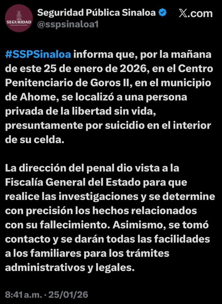 Ahome / Sinaloa / La mañana de este sábado 25 de enero de 2026 fue localizada sin vida una persona privada de la libertad al interior del Centro Penitenciario Goros II, en el municipio de Ahome, informó la Secretaría de Seguridad Pública del Estado de Sinaloa.