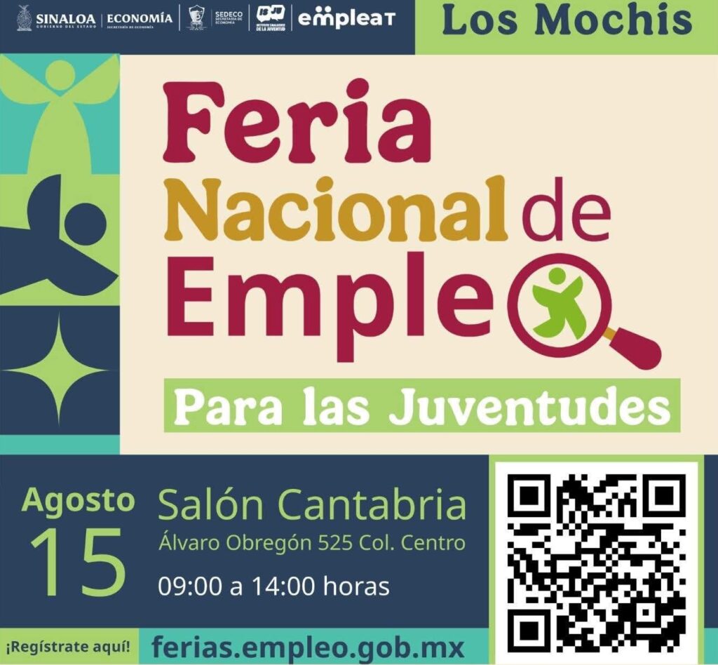 Ahome / Sinaloa / Con el objetivo de abrir puertas al desarrollo profesional y económico de la juventud ahomense, este viernes 15 de agosto se llevará a cabo en Los Mochis la Feria del Empleo para las Juventudes, un evento que reunirá más de 900 vacantes y una amplia oferta de servicios para quienes buscan trabajo o desean emprender.