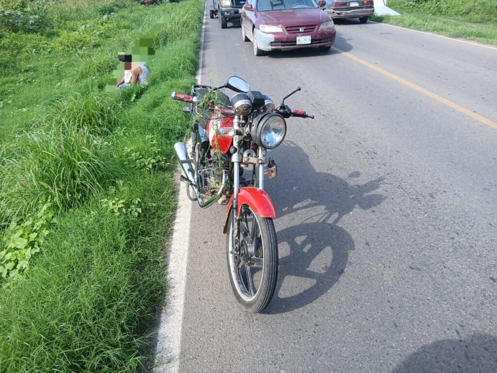 La persona, identificada verbalmente como Yoban Alejandro “N.”, de 44 años de edad, manifestó que conducía una motocicleta Italika DT 125, color rojo con negro, y que al tratar de esquivar un semoviente (vaca) que se le atravesó repentinamente, perdió el control y salió del camino, resultando lesionado.
