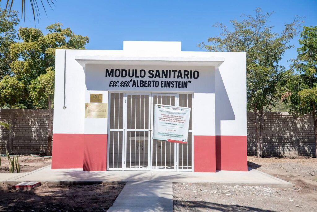 Guasave / Sinaloa / Con una inversión de 903 mil 627 pesos del Ramo 33, la presidenta municipal, la Dra. Cecilia Ramírez Montoya, entregó el nuevo módulo sanitario de la Escuela Secundaria Estatal Alberto Einstein, en la comunidad de Palos Verdes, donde además encabezó el Lunes Cívico organizado por la Dirección General de Educación.