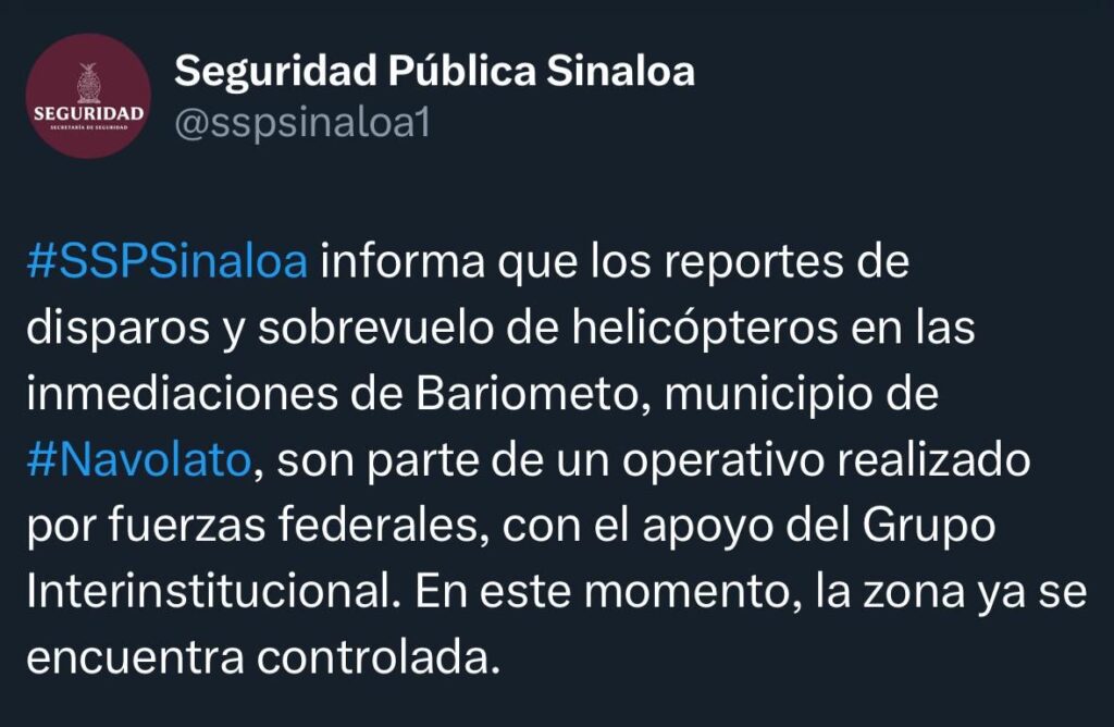 Navolato, Sinaloa — La Secretaría de Seguridad Pública de Sinaloa (SSPSinaloa) informó este jueves que los reportes ciudadanos sobre disparos y el sobrevuelo de helicópteros en la comunidad de Bariometo, perteneciente al municipio de Navolato, corresponden a un operativo coordinado por fuerzas federales.