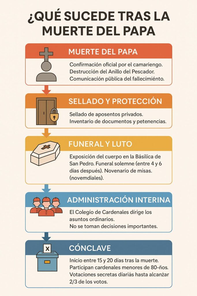 Mientras tanto, el poder no queda vacante. El Colegio de Cardenales asume la administración interina del Vaticano, aunque sin tomar decisiones cruciales. Luego, entre el día 15 y 20 tras la muerte, se convoca al esperado cónclave: un proceso cerrado y secreto donde los cardenales menores de 80 años votan diariamente hasta elegir al nuevo Papa, quien debe obtener al menos dos tercios de los votos. Así se inicia un nuevo capítulo en la historia del catolicismo.