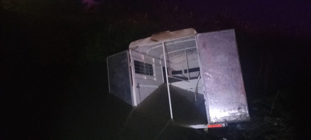 Guasave /|Un remolque que transportaba dos caballos terminó al interior de un canal la noche del sábado 28 de febrero, luego de presuntamente desprenderse de la camioneta que lo jalaba, en la carretera a Las Glorias, a la altura de la calle 300 en la comunidad de Las Tortugas.