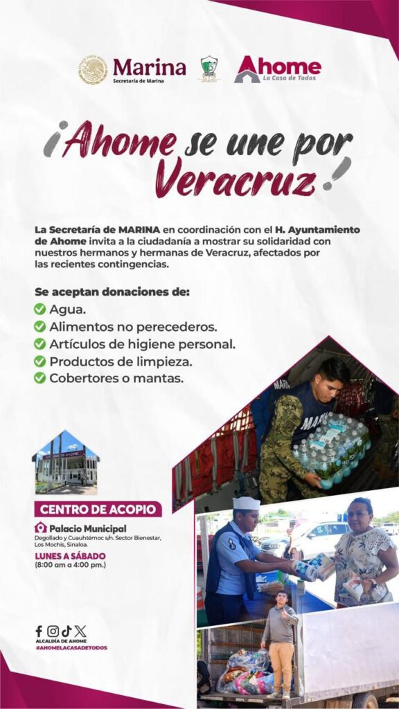 Por su parte, en el municipio de Ahome, el H. Ayuntamiento, en coordinación con la Secretaría de Marina, instaló un centro de acopio en el Palacio Municipal, ubicado en Degollado y Cuauhtémoc, en el sector Bienestar de Los Mochis.