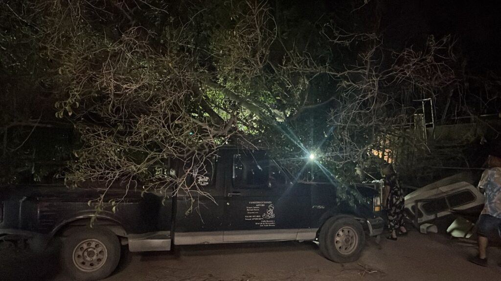 Guasave | Sinaloa | Una tormenta eléctrica de rápida formación sorprendió la noche del domingo 27 de julio a habitantes del municipio de Guasave, dejando como saldo la caída de postes en la zona de Las Parritas, así como árboles derribados en distintos sectores, algunos de los cuales impactaron vehículos estacionados.