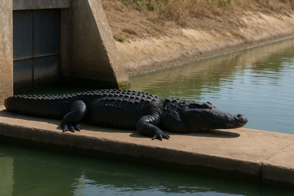 Navolato | Sinaloa | Un caimán negro de gran tamaño fue captado descansando en una compuerta de un canal de riego en la comunidad de Ensenada, perteneciente al municipio de Navolato, lo que ha generado preocupación entre vecinos del sector.