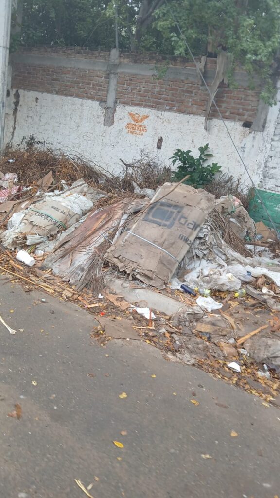 Guasave | Sinaloa | Habitantes de la zona ubicada en la calle 20 de Noviembre, esquina con Niños Héroes, denunciaron la acumulación constante de basura sobre la banqueta frente a una maderería, a un costado del restaurante La Ruina, situación que impide el paso peatonal y representa un riesgo para quienes transitan por el lugar.